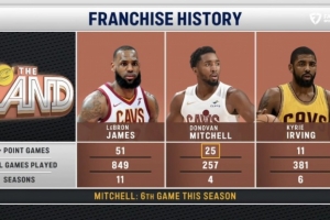 据统计,这是米切尔本赛季第6场40+,骑士生涯第25场,队史第二,仅次于詹姆斯的51场。